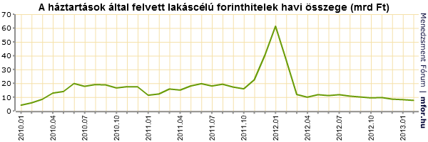 Februárban a háztartások által felvett lakáscélú hitelek átlagos évesített kamata a csökkenő BUBOR és alapkamat ellenére a januári 9,36 százalékról 9,44 százalékra emelkedett, de ez még így is a 2012 előtti időszak jellemző kamatszintjével megegyező. Minden bizonnyal egyébként nem ez a minimális emelkedés volt a fő ok, de a háztartások a korábbinál ismét kevesebb hitelt igényeltek lakás célra, mindössze 7,7 milliárdnyit a januári 8,2 milliárd után. Ez lényegében a válságot közvetlenül követő időszaknak felel meg.