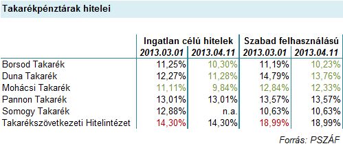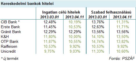 A PSZÁF adatai alapján a banki és takarékpénztári termékek teljes hiteldíjmutatóiban bekövetkezett változások arra engednek következtetni, hogy a márciusi jegybanki statisztika újabb, akár jelentős kamatcsökkentést is közölhet. A nagyobb bankok ugyanis jelentősen mérsékelték a nem akciós, piaci kamatozású lakás célú és szabad felhasználású hitelek kamatát. Kiemelendő közülük is az OTP Bank, mely közel 1 százalékponttal csökkentett, és az Unicredit, mely 70 bázispontos mérséklést eszközölt. A Raiffeisen pedig a márciusban végrehajtott módosításnak köszönhetően az Unicredithez hasonlóan 10 százalék alatt kínálja a lakáscélú hiteltermékét, és egyedüliként a szabad felhasználásút is.