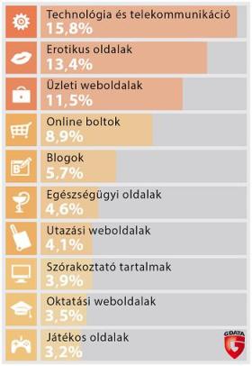 A vírusirtó szoftvereket gyártó G Data kategorizálta, hogy milyen témájú weboldalak terjesztenek leggyakrabban kártevőket. A toplistát 15,8 százalékkal a technológiai témájú oldalak vezetik – például letöltésgyűjtemények és hamis vírusirtó programokat kínáló weboldalak.