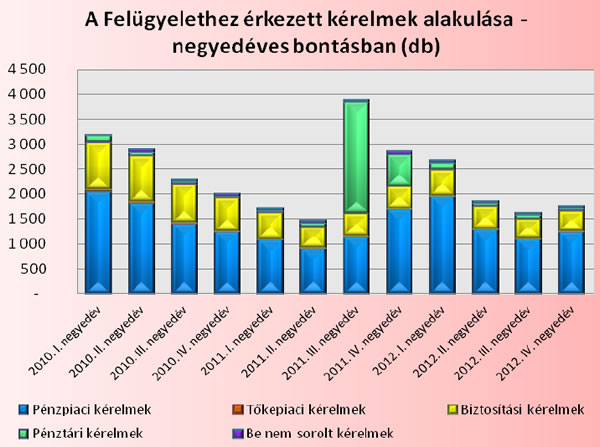A Pénzügy Szervezetek Állami Felügyelete közzétette 2012 negyedik negyedévére vonatkozó fogyasztóvédelmi jelentését, mely szerint összesen a három hónap alatt 1750 fogyasztói kérelem érkezett a szervezethez.