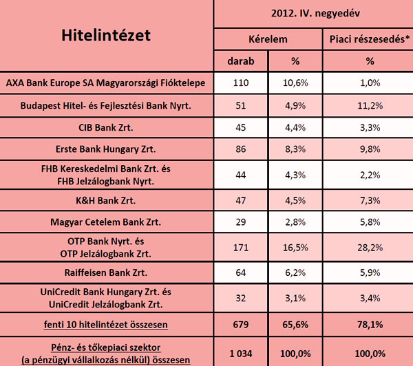 A legtöbb kérelem az AXA Bankkal kapcsolatban érkezett: 110 db a vizsgált három hónap alatt. Ez az összes kérelem 10 százalékát teszi ki, ami bőven nagyobb a bank 1 százalékos piaci részesedésénél. Piaci súlyához mérten szintén problémásnak minősíthető még a CIB Bank - számszerűen 45 -, illetve az FHB és a Raiffeisen Bank 44, illetve 64 kérelemmel. A kérelmek abszolút számát tekintve viszont az OTP áll az élen, hiszen 171 darab érkezett a felügyelethez, ám a bank 28 százalékos piaci részesedése alatt van jócskán a 16,5 százalékos panaszarány.