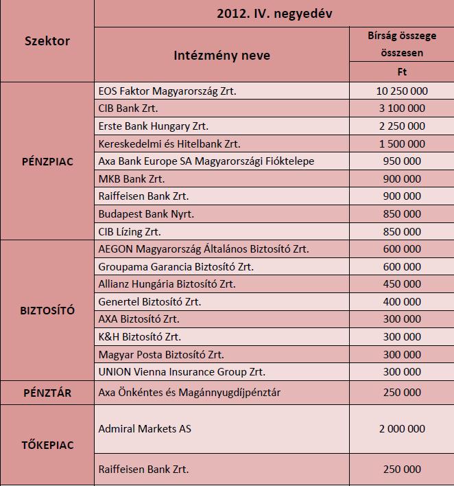 A 2012. IV. negyedévben összességében a legnagyobb összegű bírsággal szankcionált intézmények szektoronkénti megoszlását az alábbi táblázat mutatja be:
