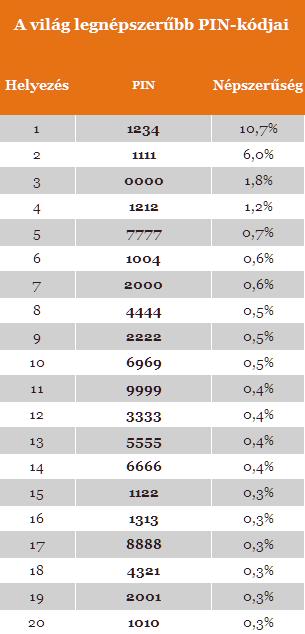 A felmérés szerint az emberek közel 11 százaléka a leginkább kézenfekvő 1234 számsort választja a 10 ezer számkombináció közül. Ezt a gyakorlati példával érzékeltetve úgy is mondhatjuk, hogy ha egy tolvaj egy lopott bankkártyával próbál meg pénzt felvenni vagy fizetni, egy a tízhez az esélye, hogy sikerrel jár. A második és harmadik helyen szintén villámgyorsan kitalálható kódok, az 1111 és a 0000 szerepelnek, de toplista telis-tele van egyszerű kódokkal, mint például a negyedik helyen szereplő 1212, vagy az illusztris rangsorban 10. -vélhetően szexualitásra utaló másodlagos tartalma miatt könnyen megjegyezhető- 6969.
