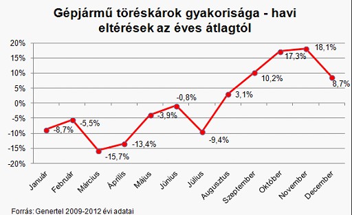 A Genertel által összeállított felmérés szerint – bár a téli hónapokban gyakran az őszi időjárásnál is kedvezőtlenebb körülményekkel találkozhatnak az autósok – a legveszélyesebbnek az őszi hónapok számítanak, amikor sokan még nem készítik fel autójukat a hideg hónapokra, emellett vezetési stílusukat sem igazítják a megváltozott körülményekhez. az autósok októberben és novemberben szenvedik el a legtöbb töréskárt: ilyenkor az éves átlaghoz képest 17-18 százalékkal több ilyen jellegű baleset történik.