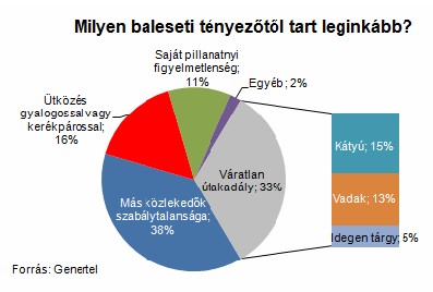 A Genertel által megkérdezett autósok 38 százaléka leginkább más közlekedők szabálytalanságától tart, de a váratlan útakadályok (33%) és az autó elé kerülő személyek (16%) által képviselt veszélyt is sokan megemlítették, mint olyan baleseti tényezőt, amelytől legjobban tartanak. A saját pillanatnyi figyelmetlenséget csak minden tízedik autós választotta ennél a kérdésnél, pedig a valóságban – még ha ez utólag nehezen kideríthető is – ez a tényező becslések szerint csaknem minden ötödik balesetben szerepet játszik.