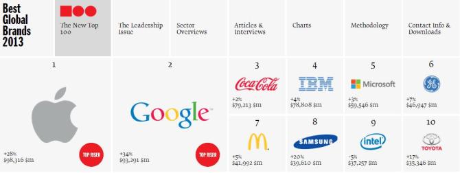 A cég "Best-Global-Brands" című felmérésének 14 éves története során elsőként idén esett meg, hogy a Coca-Cola csak a harmadik helyen tudott végezni. A világ 100 legértékesebb márkáját értékelő listán a technológiai óriások átvettál a vezetést. Az Apple és a Google szerezte meg az első két helyet az Interbrand által összeállított-, a világ 100 legelismertebb márkáját rangsoroló 2013-as listán.