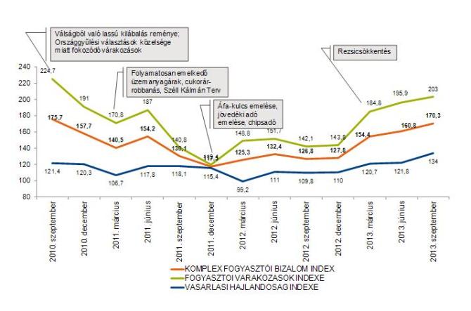 A Fogyasztói Várakozások Indexe immár egy éve töretlenül, így 2013 harmadik negyedévében is emelkedett 7,1 ponttal és értéke jelenleg 203 pont. E növekedés hátterében az áll, hogy javult a háztartások saját anyagi, valamint az ország gazdasági helyzetének megítélése egyaránt. Ez utóbbi esetében a rövid távú, azaz az elkövetkező 12 hónapra vonatkozó várakozásokban következett be pozitív elmozdulás úgy a tavalyi év azonos időszakához képest mint 2013 júniusához képest is.