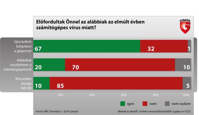 A G Data német vírusvédelmi cég ezer magyarországi internetezőt kérdezett meg arról, hogy megfertőződött-e számítógépe tavaly, és ha igen, akkor milyen kár érte őt ennek következtében. A kutatás eredményéből kiderült, hogy a 18–75 év közötti internetező lakosság harmadának, azaz 1,35 millió embernek a számítógépe fertőződött meg. A leginkább érintett korcsoportok a 40–49 (38%) és a 18–29 év közöttiek (34 százalék) voltak.