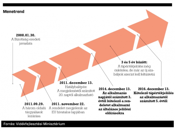 Új előírás például, hogy a tápértéket is fel kell majd tüntetni az élelmiszereken. Nagy feladat ez a vállalatok és a hatóságok számára, ezért erre két év átmeneti időszakot, „türelmi időt” biztosít a rendelet, vagyis a tápérték jelöléseknek 2016. december 13-tól kell kötelezően megjelenniük a termékeken. 2014 és 2016 között is lehet önkéntesen tápértéket feltüntetni, de már kizárólag az új előírások szerint. Vagyis a kétlépcsős bevezetéssel elegendő felkészülési időt kapnak a vállalkozások. Lényeges változást jelent a rendelet az allergén jelölés terén. Idáig is kötelező volt az élelmiszerek allergén tartalmáról tájékoztatást adni, de ezentúl az összetevők sorában jól láthatóan ki kell emelni ezeket. A másik újdonság, hogy a nem előrecsomagolt élelmiszerek esetében is tájékoztatást kell adni a fogyasztóknak az ilyen összetevőkről.