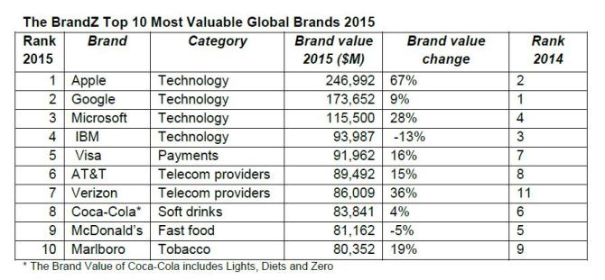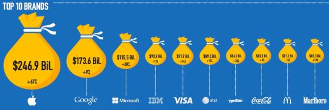 Az Apple márkaértéke évről-évre 67%-os növekedést mutat, így 2015-re elérte a 247 milliárd dollárt. A második helyet elfoglaló Google 9%-os növekedésével jelenleg 173,3 milliárd dollárt ér.